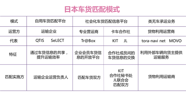 虽然日本快速发展,但返程空驶空载、实载率不高,日本2016年卡车实载率仅为41%。部分有实力的企业希望构建自有的车货匹配平台,用于整合内部的运输业务,提升运输效率,降低物流运输成本。部分中小企业选择参加由合作社建立的车货匹配平台或是第三方车货匹配平台,来满足自身车货匹配业务的需求。这些需求为物流信息平台的出现创造了有利的条件。