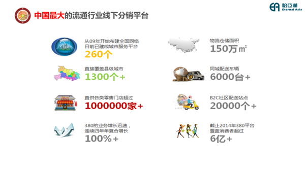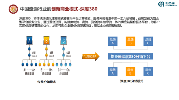 380平台的商业价值主要包括:实现渠道扁平化,提高流通效率;整合营销,提升市场规模;实现总成本领先,提高产品竞争力;目标终端全覆盖,制胜终端。