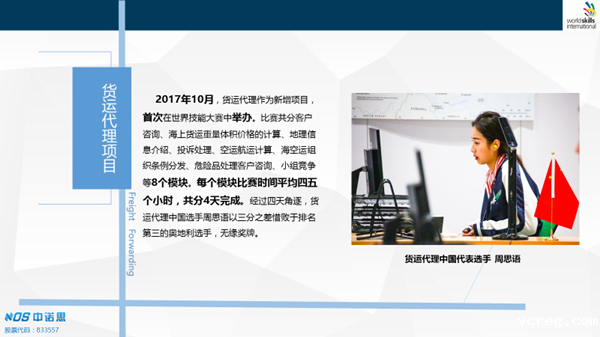 2017年10月,货运代理作为新增项目,首次在世界技能大赛中举办。经过四天角逐,货运代理中国选手周思语以三分之差惜败于排名第三的奥地利选手,无缘奖牌。