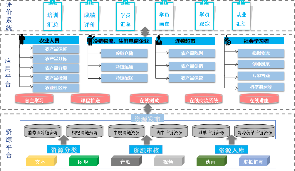 搭建一个基于云计算、大数据、移动互联网等新一代信息技术的在线公共学习平台。平台具备资源管理、在线学习、智能测评等功能。通过该平台冷链物流从业人员能够实现不受时间、地点、空间的限制随时随地的学习。