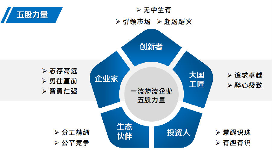 做物流产业的引领者;做物流格局的破局者;做物流创新的推动者;做物流网络的搭建者;做社会责任的倡导者。