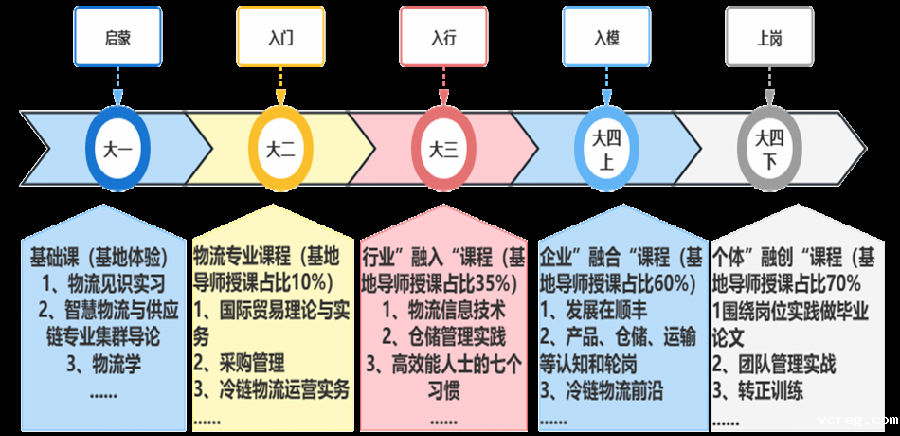 在物流专业人才培养方面,我们坚持的原则是:大一启蒙,大二入门,大三入行,大四上学期入模,大四下学期毕业即上岗,如下图所示: